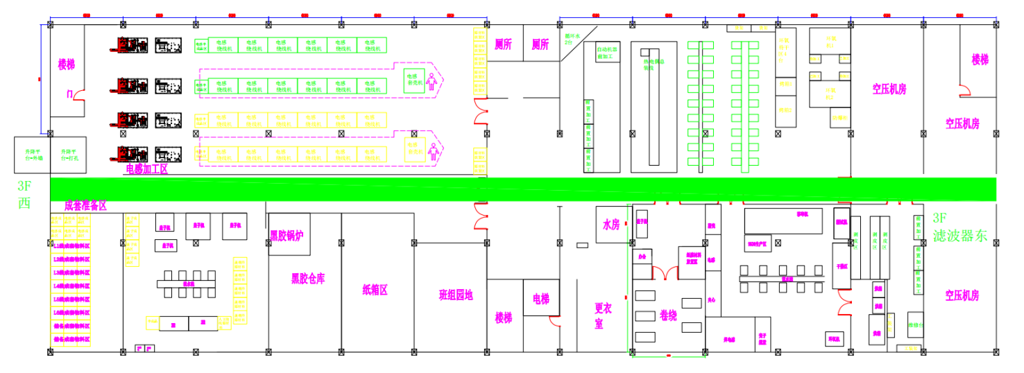 從宏觀層面,考慮整個濾波器生產車間的功能區域,減少物流搬運次數;構建連續流的生產線,導入物流配送系統應用ECRS原則、簡易自動化等方法,重新提排布生產線。