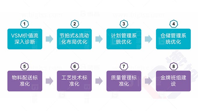 經過20多年的沉淀和實踐,上海博革咨詢總結出適合國內制造型企業精益管理變革的模型BPS。下面的“精益生產推進8大步驟”是從BPS模型中導出的,適合國內絕大部分機械行業的精益生產推進方法。