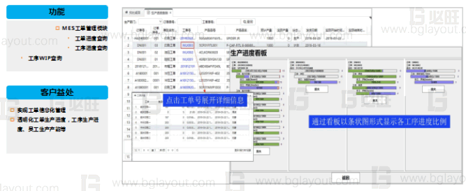 生產(chǎn)進(jìn)度數(shù)字化:實(shí)時(shí)展現(xiàn)訂單、工單在各個(gè)工序的生產(chǎn)進(jìn)度(計(jì)劃數(shù)量、產(chǎn)出數(shù)、不良數(shù)、在制數(shù))、工位及員工的實(shí)時(shí)生產(chǎn)進(jìn)度。