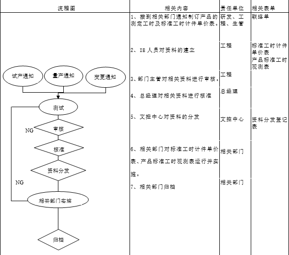 5.3當(dāng)IE接到產(chǎn)品的變更通知單.或者工裝改進(jìn).工藝改善.新設(shè)備.廠房重新規(guī)劃時.員工的熟練程度提高時.均應(yīng)重新評估.并制定符合現(xiàn)狀的標(biāo)準(zhǔn)工時.參照5.2