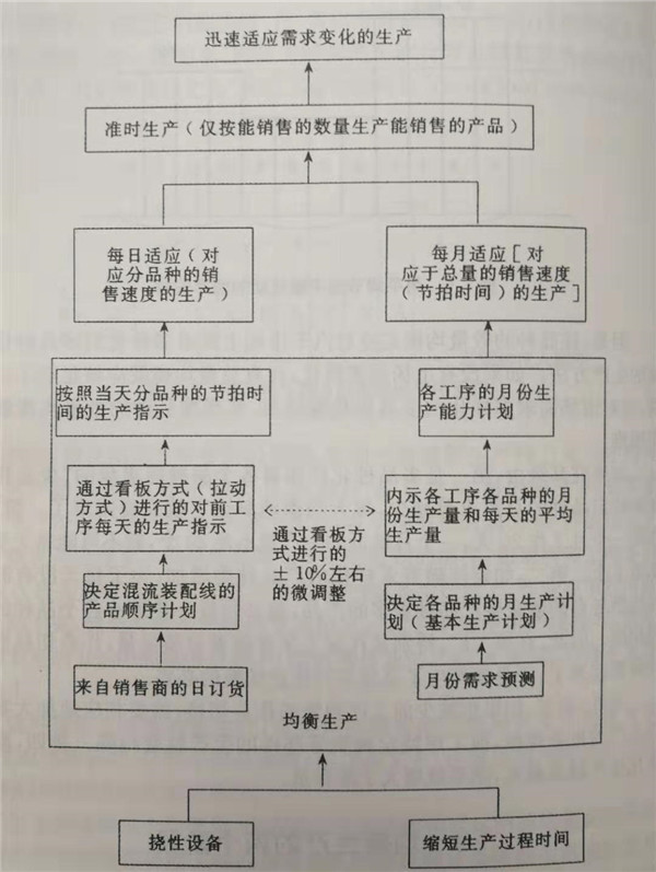 圖1表示了均衡生產的兩個階段。第一階段是適應年度中每個月的需求變化(月份適應),第二階段是適應每個月中每天的需求變化(每日適應)。其中,月份適應要通過月度生產計劃來實現(xiàn)。也就是制定基本生產計劃,按照它來確定并指示該廠各工序每天的平均生產量。這個基本生產計劃,按照每個月的需求預測制定