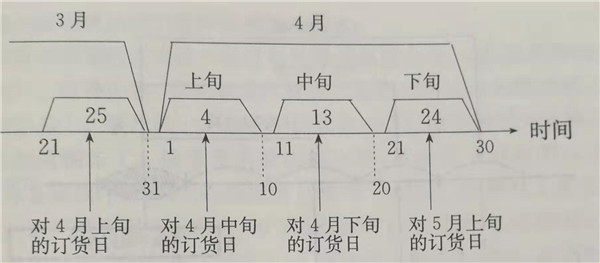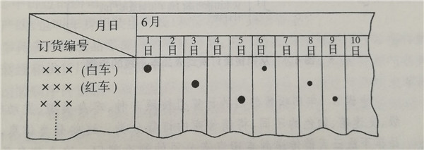 步驟1 來自銷售商的旬訂貨,各銷售商在汽車廠基本生產(chǎn)計劃確定的本月領(lǐng)取輛數(shù)的范圍內(nèi),將最終分規(guī)格的10天份的訂貨在7天至8天前通過微機聯(lián)網(wǎng)提供給汽車廠的銷售部門(參看圖1)。所謂最終規(guī)格,就是將剛才講過的按大分類的規(guī)格的車型,進一步通過對任選部件(訂貨要求的裝備)的選擇、車的顏色的選擇細分后的規(guī)格。接著,在生產(chǎn)管理部門按照旬訂貨來計劃分工廠,分生產(chǎn)線的日產(chǎn)量,這就是對前面所講述的基本生產(chǎn)計劃的修正,另外,豐田汽車公司還要向各家銷售商報告圖2那樣的配送預(yù)定表( Delivery Schedule),這個預(yù)定表的編制,從接受旬訂貨開始需要兩天的時間。