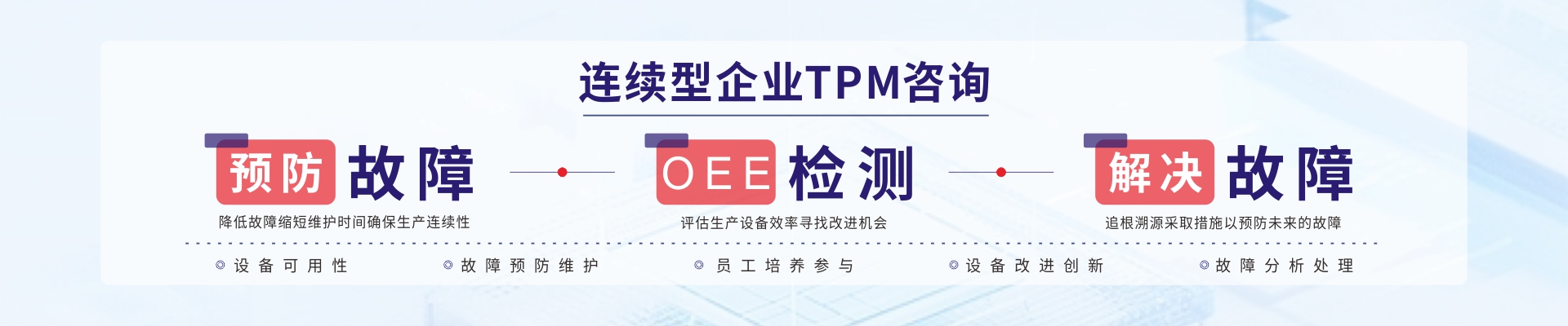 02 設(shè)備運(yùn)維管理 博革咨詢TPM推進(jìn)采取“自主維護(hù)”+“專業(yè)維護(hù)”雙軌制的模式;PM的咨詢老師具有設(shè)備管理專業(yè)背景(設(shè)備工程師/電氣工程師/二級(jí)技師/PLC工程師/中國(guó)設(shè)備協(xié)會(huì)會(huì)員等),在大型企業(yè)設(shè)備總監(jiān)/經(jīng)理的從業(yè)經(jīng)歷,并具有大型線纜行業(yè)經(jīng)驗(yàn),擅長(zhǎng)解決設(shè)備專業(yè)難題;AM的咨詢老師擅長(zhǎng)自主維護(hù)標(biāo)準(zhǔn)和流程管理,營(yíng)造全員改善氛圍,提升設(shè)備維護(hù)技能等