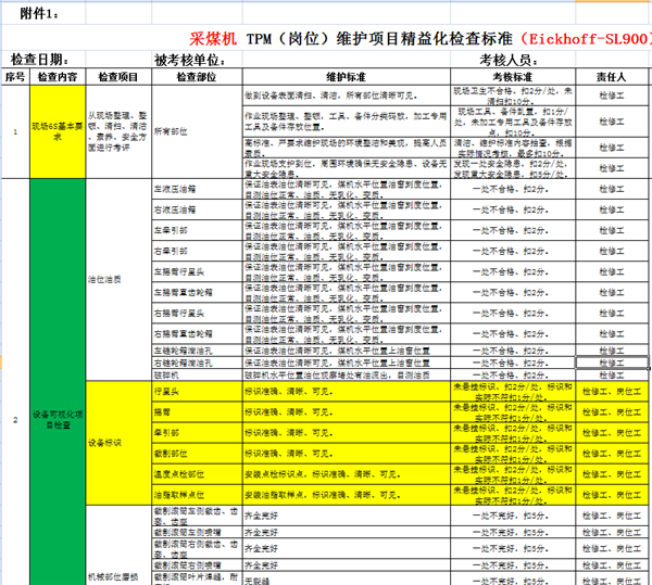 針對主要采掘設(shè)備、主運(yùn)輸設(shè)備試點(diǎn),梳理現(xiàn)場6S基本要求、設(shè)備可視化項(xiàng)目檢查、設(shè)備檢修及運(yùn)行現(xiàn)場動態(tài)檢查、設(shè)備自主保全、全員維護(hù)記錄,編制TPM(崗位)維護(hù)項(xiàng)目精益化檢查標(biāo)準(zhǔn)工單。