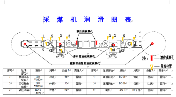 2016年5月份,從綜采隊(duì)試點(diǎn)梳理設(shè)備潤滑維護(hù)標(biāo)準(zhǔn)可視化基礎(chǔ)提升管理方法,結(jié)合現(xiàn)有設(shè)備圖冊、潤滑標(biāo)準(zhǔn)、TPM可視化相關(guān)要求制作綜合看板,摒棄了以前的文字描述、該方式圖文并茂,有利于相關(guān)人員的掌握,現(xiàn)已在22204-1面開始實(shí)施