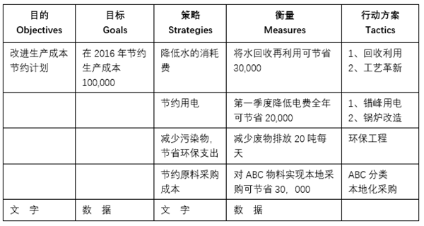 2015年6月份,機(jī)電辦精益化管理組編制下發(fā)OGSM目的、目標(biāo)、策略、衡量、行動方案)分解策略執(zhí)行法試行推廣,該方法旨在理清管理人員系統(tǒng)的想法、精確地分析問題、看到核心問題的所在,最后制定清晰的目的及目標(biāo)。在梳理目標(biāo)任務(wù)的同時,將行動方案一并進(jìn)行落實(shí)