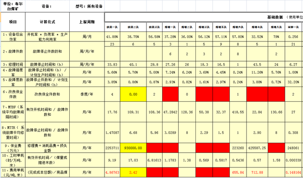 2015年年底,由礦機(jī)電辦制作在用采掘設(shè)備、主運(yùn)輸設(shè)備履歷信息表模板下發(fā)各單位填寫、月度上報,包括設(shè)備總覽技術(shù)特征匯編、不同設(shè)備履歷分頁預(yù)覽,主要內(nèi)容有設(shè)備遷入、遷出時間、大型部件、備件更換情況、數(shù)量、更換原因等,為TPM設(shè)備保全管理提供了詳細(xì)的基礎(chǔ)資料、也為內(nèi)部調(diào)劑單位提供了詳細(xì)的設(shè)備服役期狀況參考,提升設(shè)備狀態(tài)把握水平