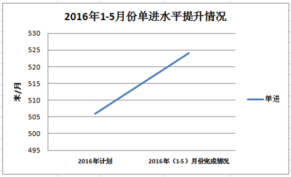b)單進(jìn)成果;2016年初單進(jìn)計(jì)劃510.14米/月,2016年1-5月份單進(jìn)水平524米/月 ,剔除停產(chǎn)影響,1-5月份單進(jìn)實(shí)際完成549.3米/月,較年初計(jì)劃提升8.56 %
