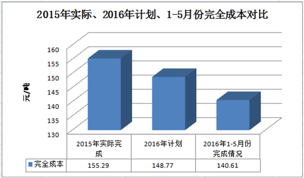 d)完全成本: 2016年全礦完全成本控制指標(biāo)148.77元/噸,1-5月份實(shí)際完成140.61元/噸,較2016年初計(jì)劃降低5.80%,較2015年完成情況降低10.44%